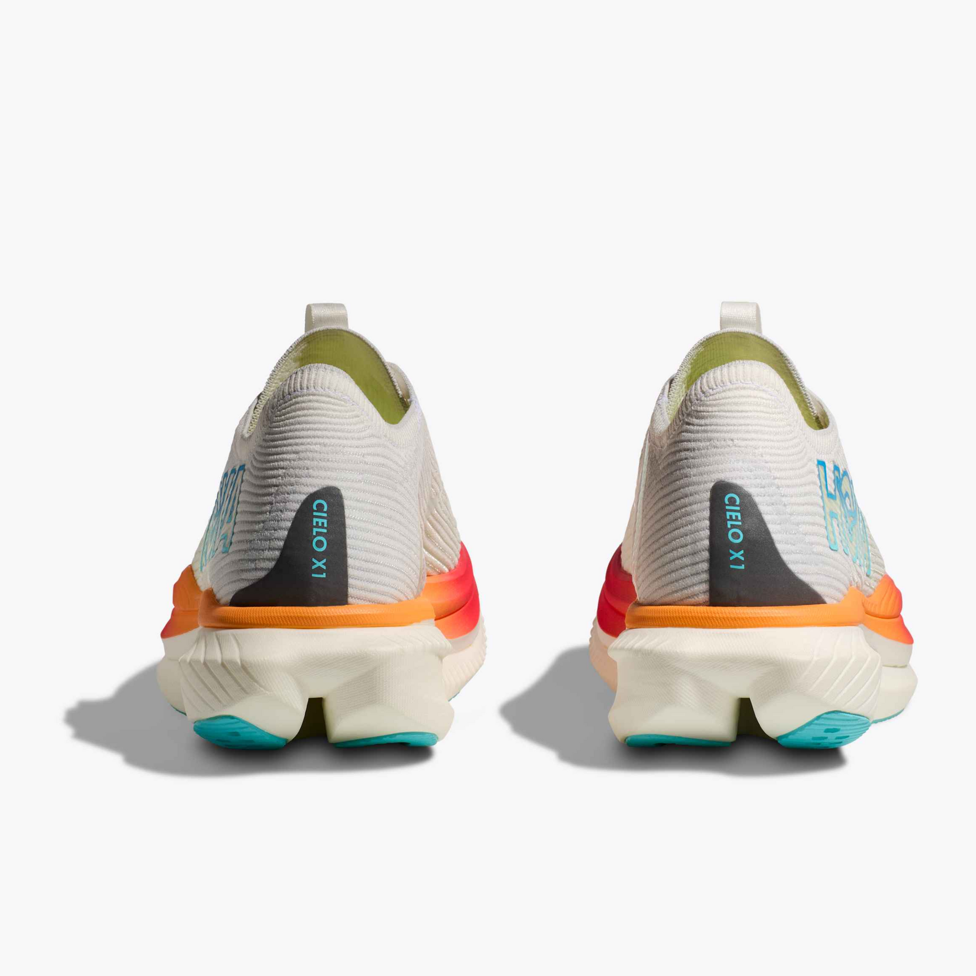 Las Hoka Cielo X1, un modelo de carretera diseñado para la competición, con una placa de fibra de carbono reforzada entre dos capas de espuma PEBA, un diseño de rocker agresivo que impulsa la zancada, y un upper de malla transpirable